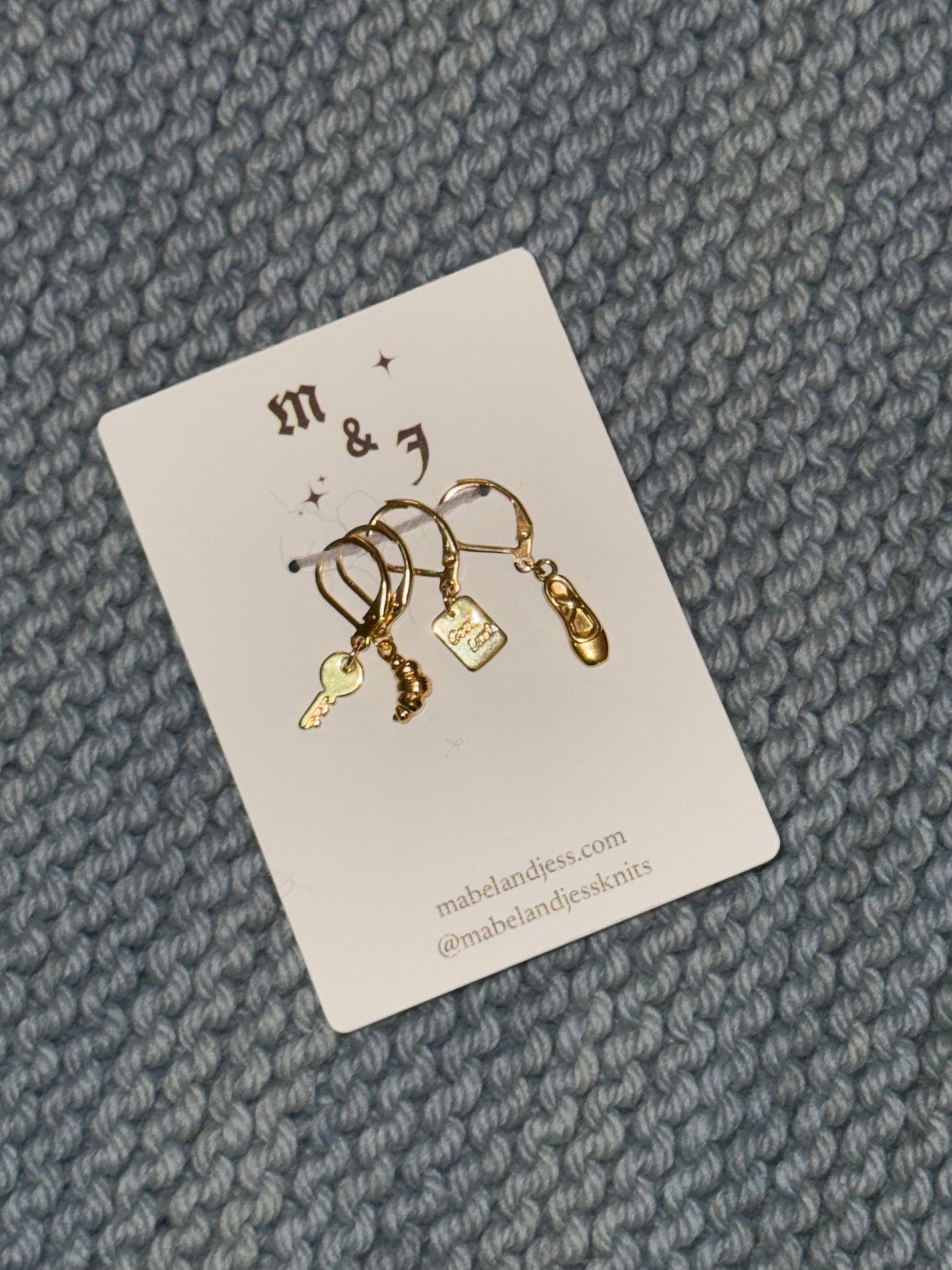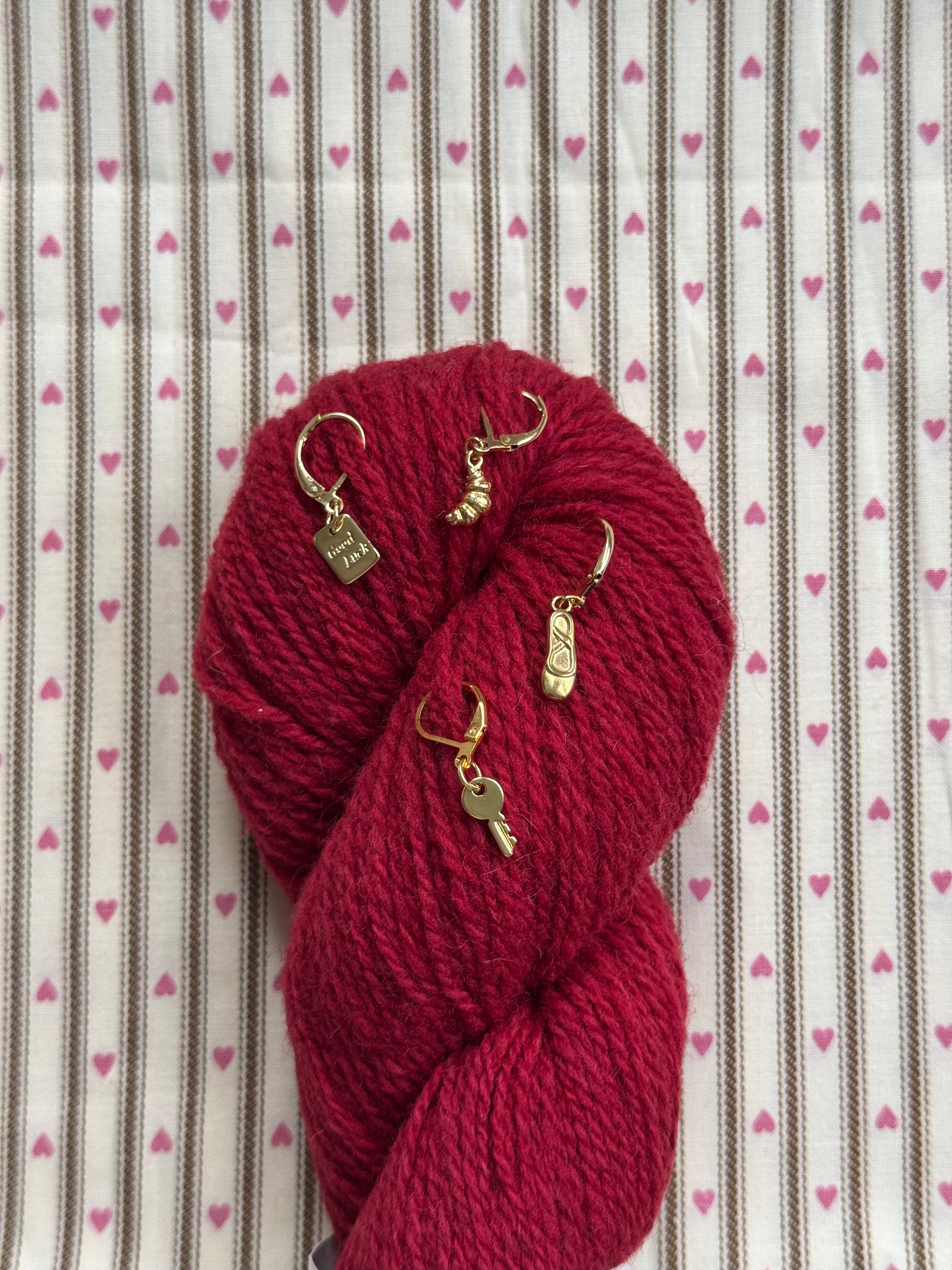 Set of 4 (1 of each) gold plated key, croissant, 'good luck' tag, and ballet slipper stitch markers.